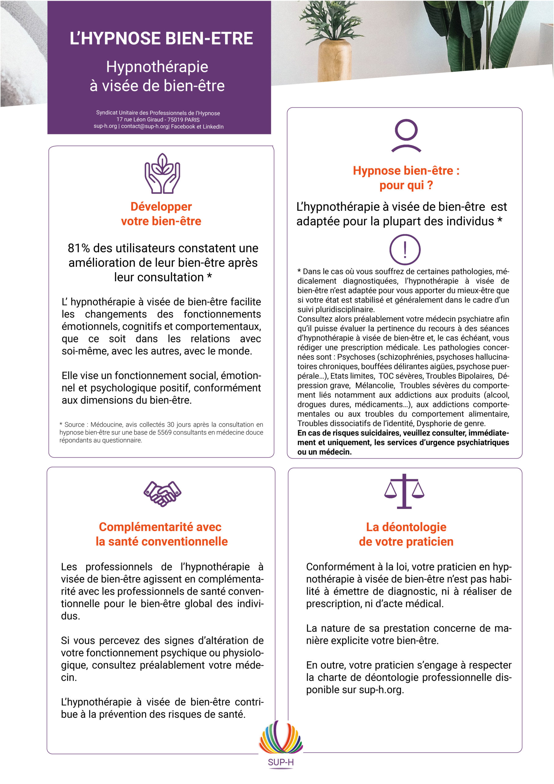 Nous vous invitons à lire le Code de Déontologie (page 3) ainsi que la Charte d’Éthique du Syndicat National des Hypnothérapeutes (Page 6) ci-joint afin de comprendre les pratiques du praticien.
